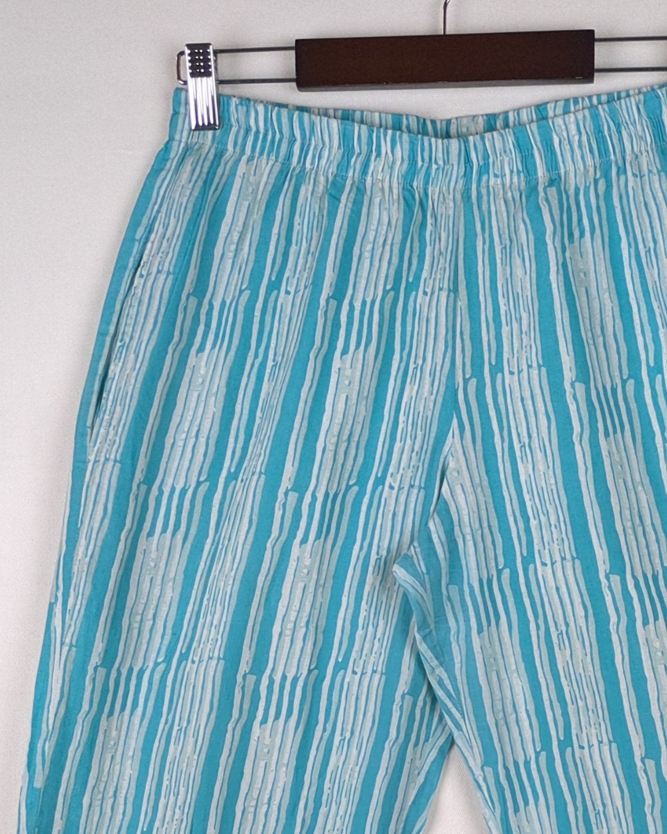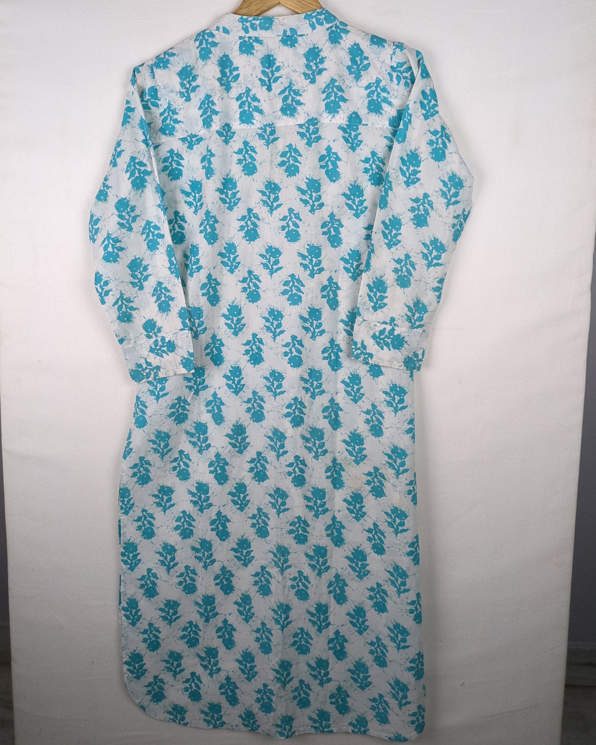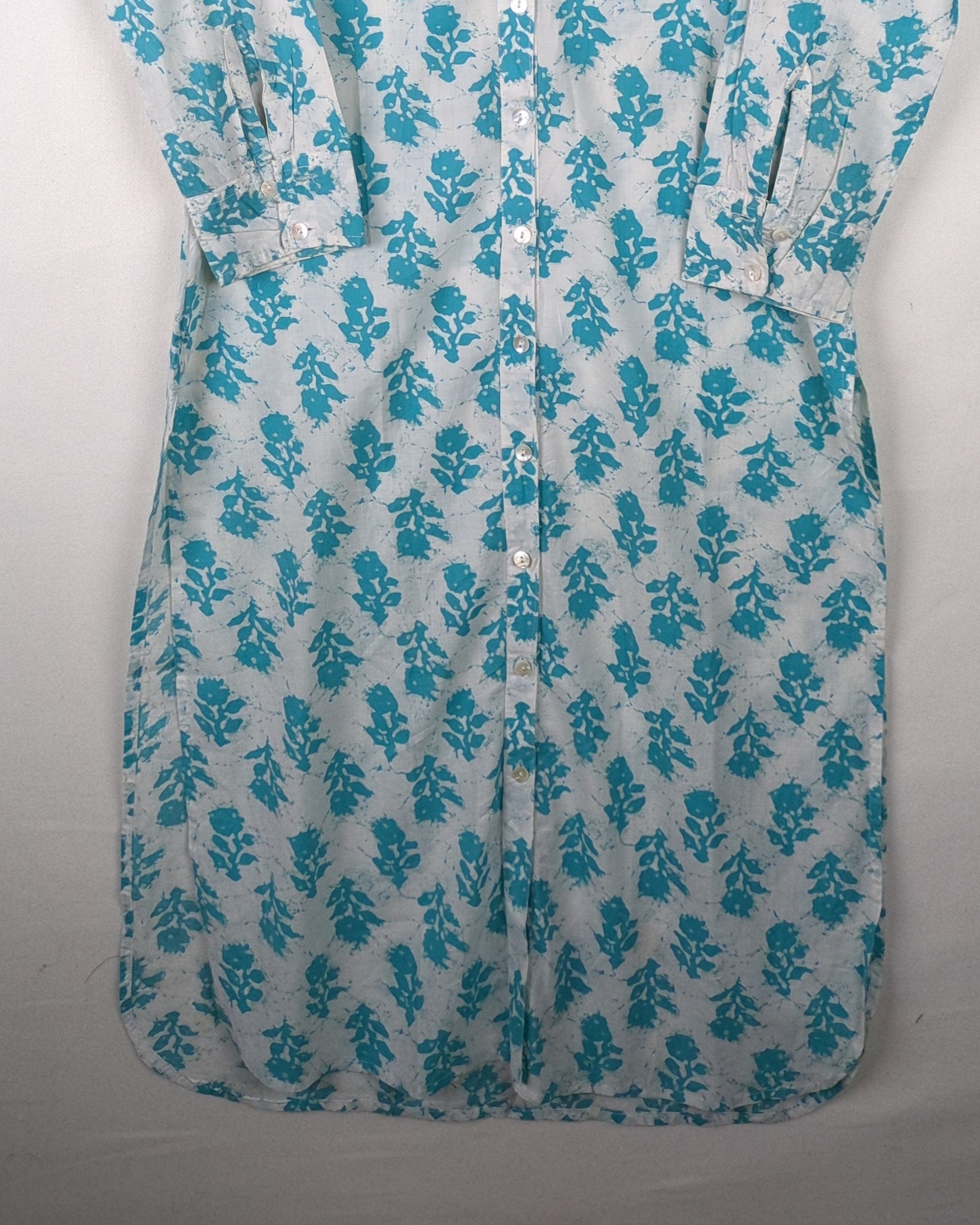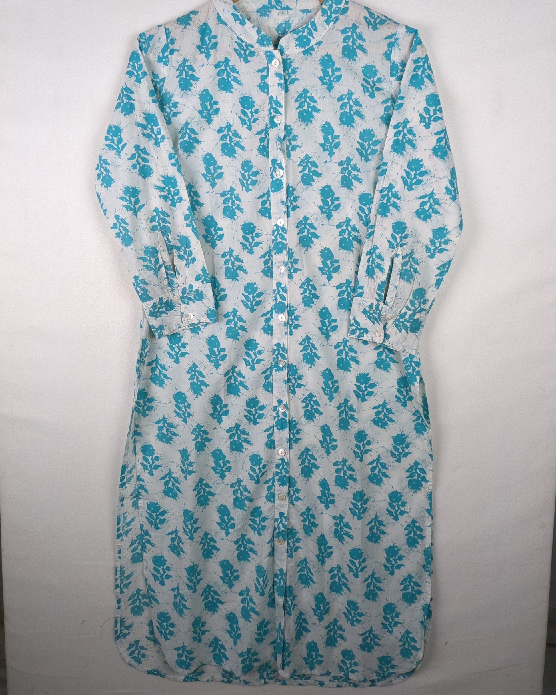 Teal and white floral print coord set designed with a mandarin collar and a full button-down front.
