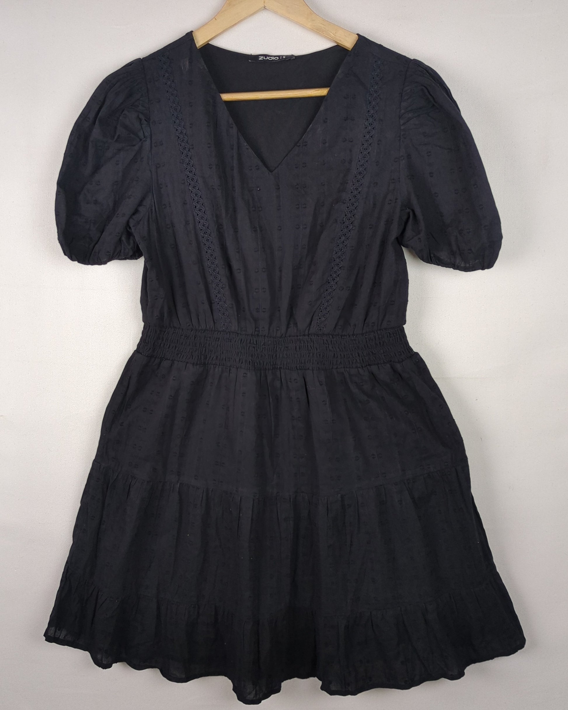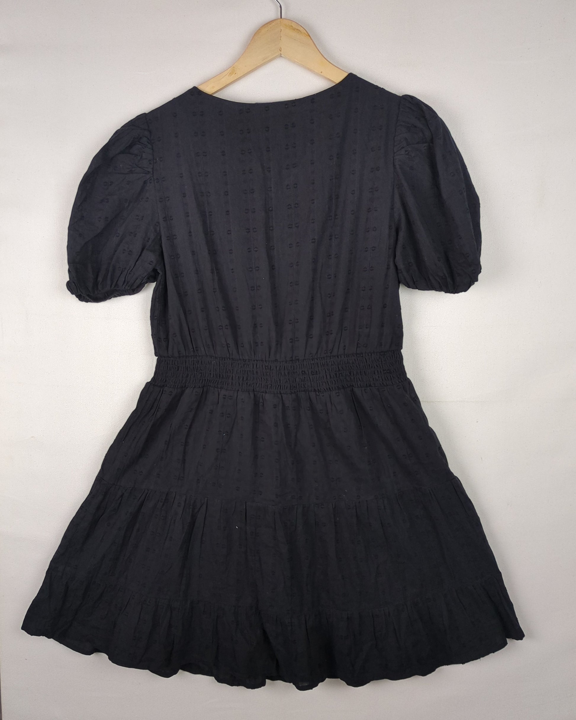 Chic black tiered mini dress designed with puff sleeves, a smocked waist, and delicate lace trim.