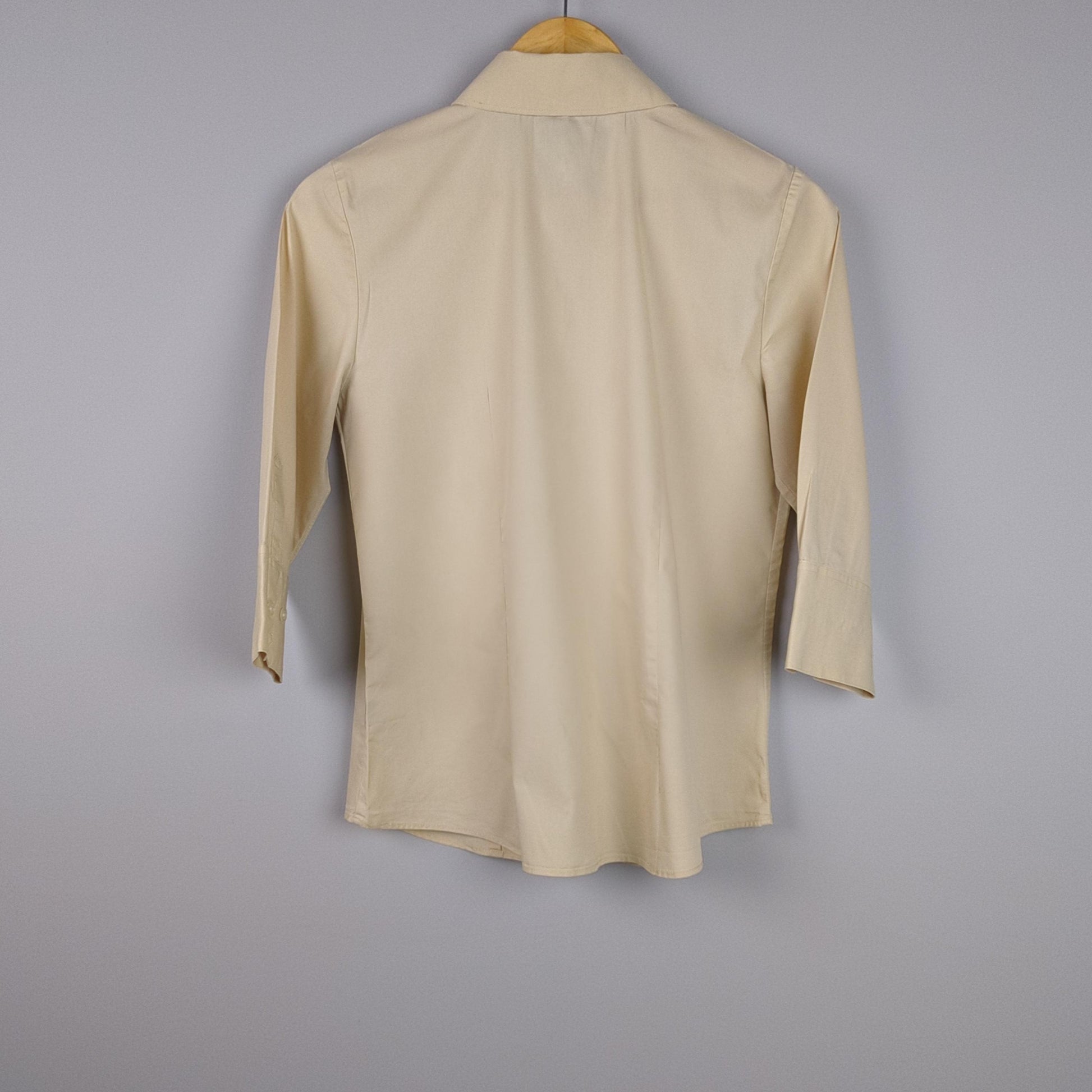 This is a classic solid shirt with button-up closure and three-quarter sleeves, perfect for a stylish and versatile look.