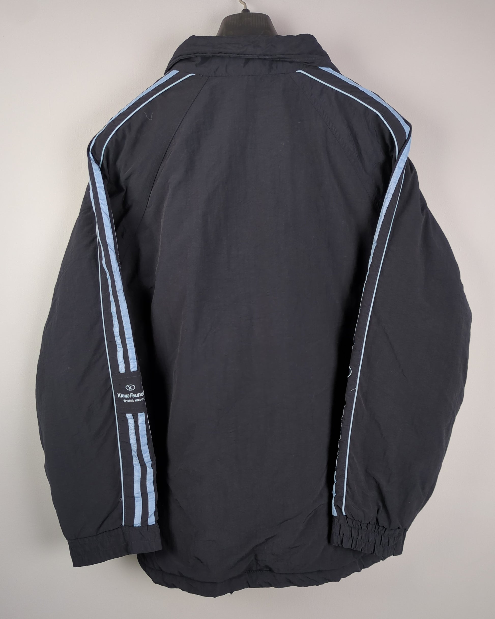 This zip-up sport jacket features a high collar and light blue triple stripes on the sleeves.