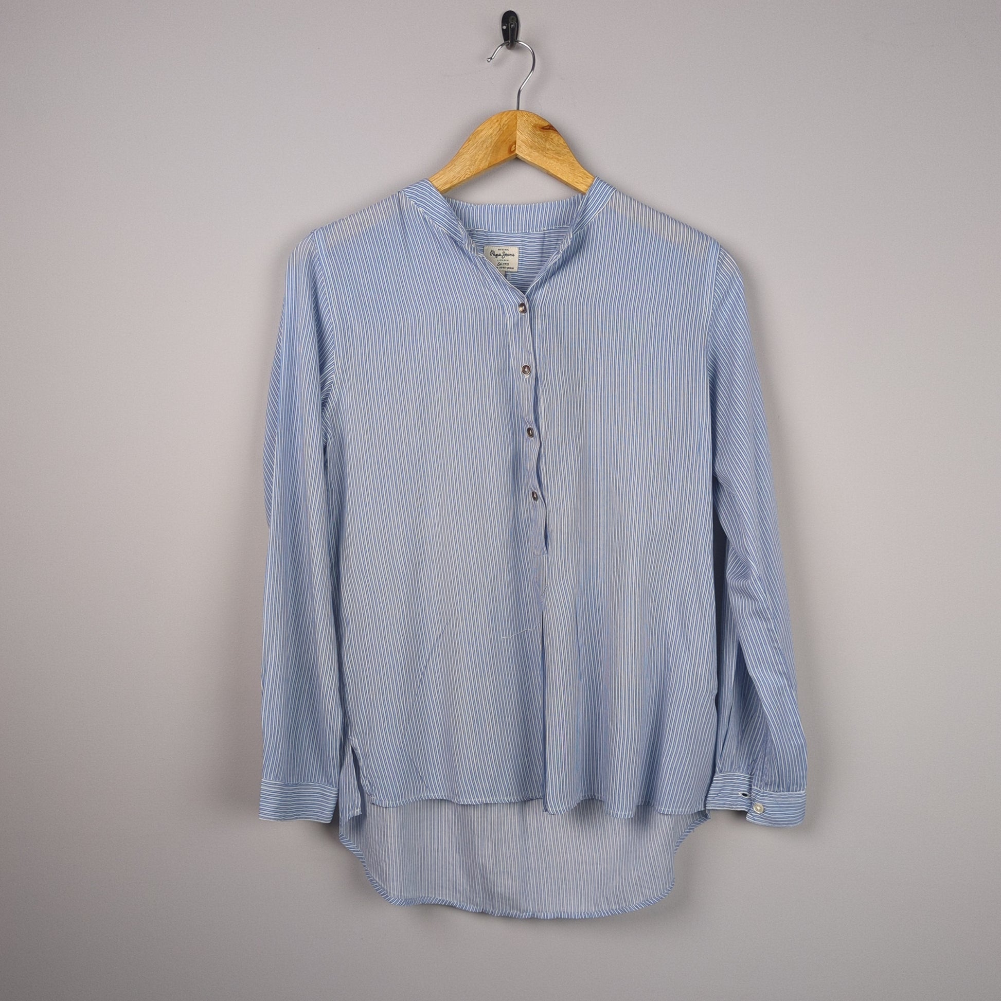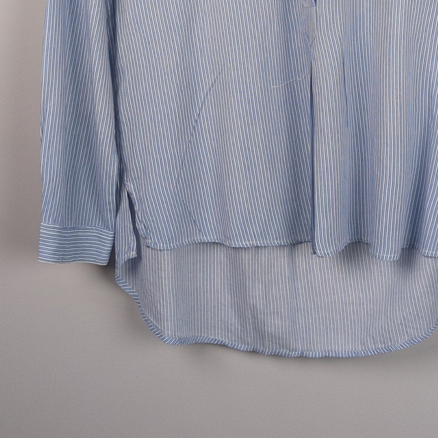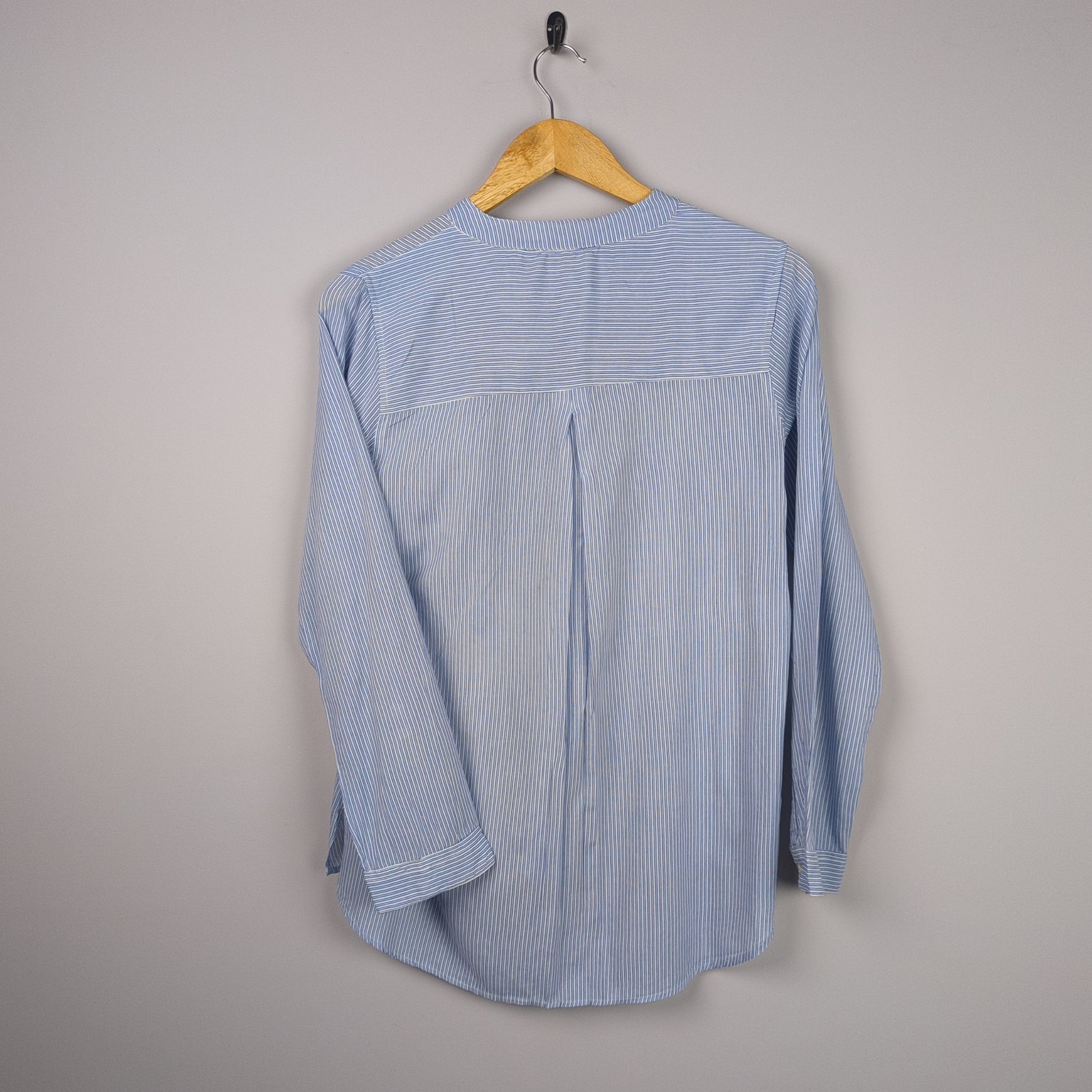 This light blue and white striped blouse has a band collar with button-down detailing and long sleeves.