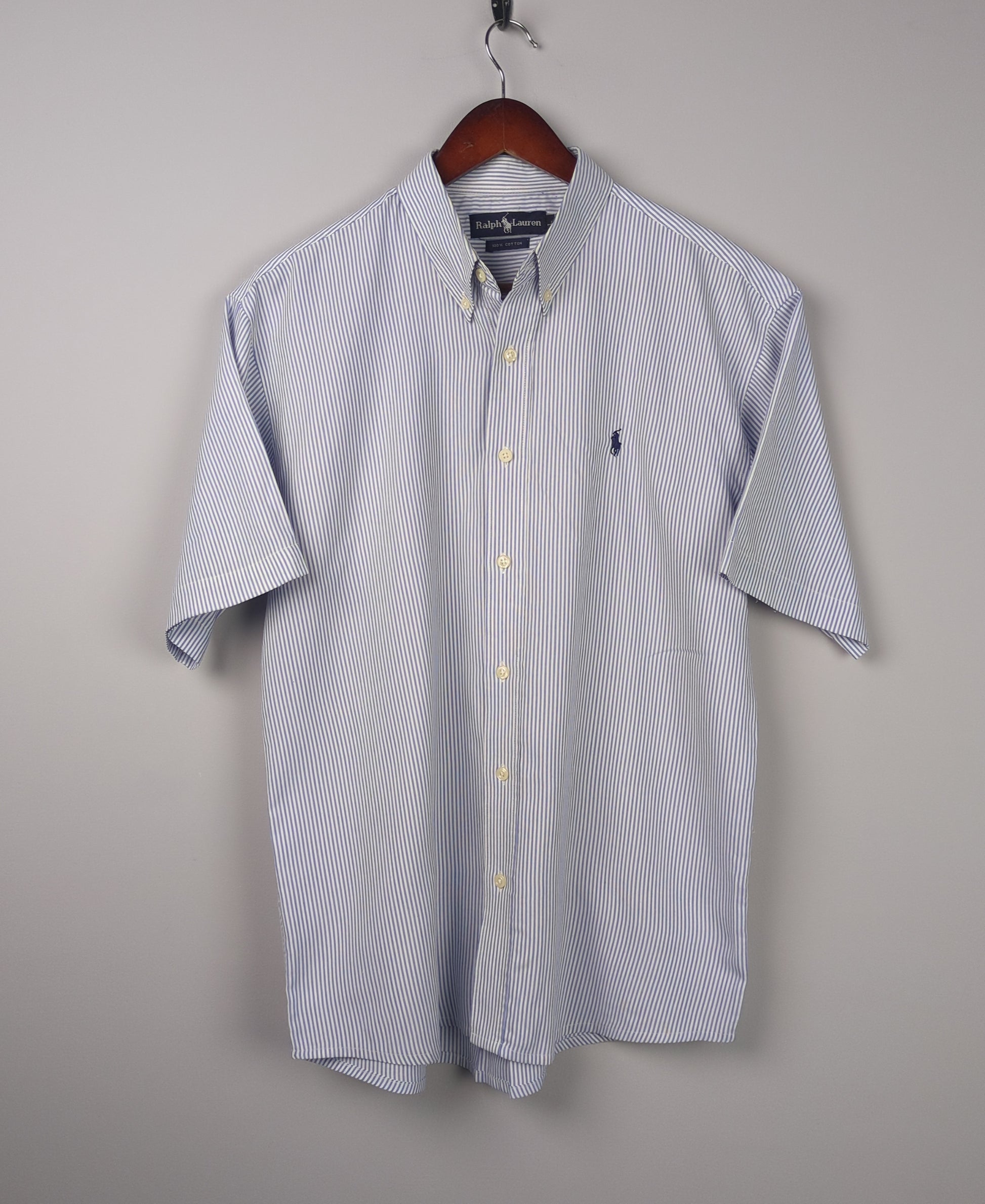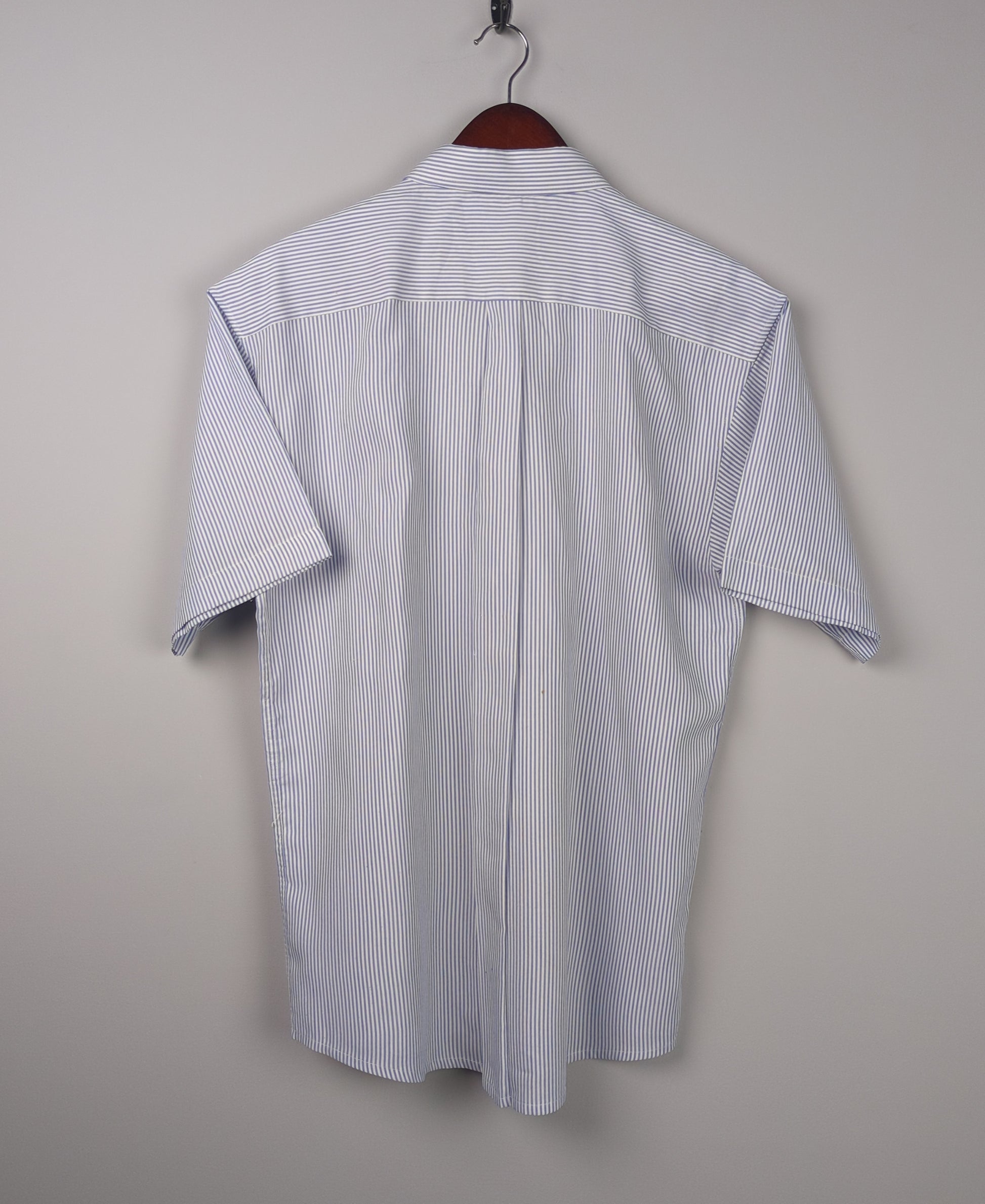 This classic short-sleeve button-down shirt features a crisp, striped pattern.