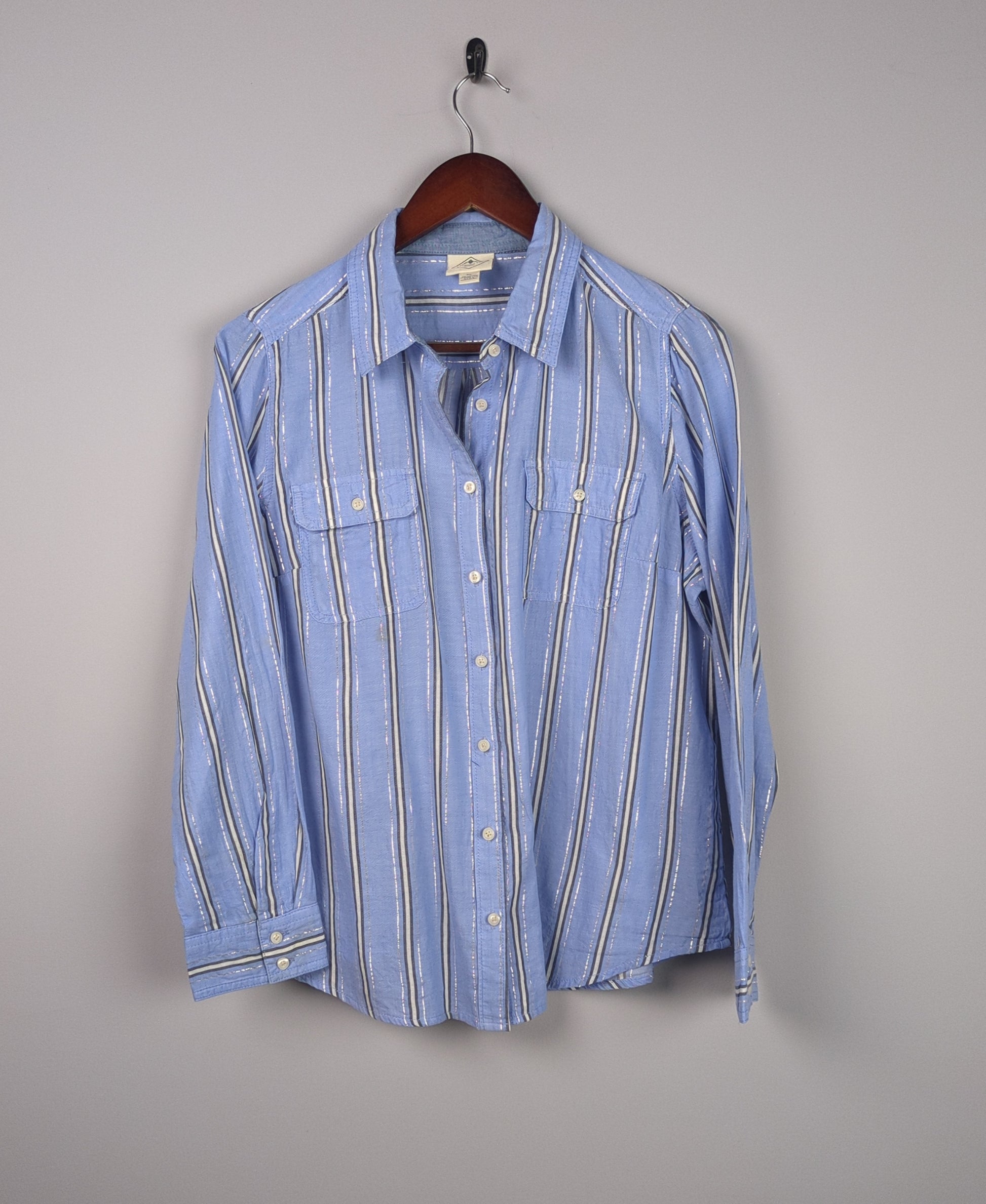 This light blue button-down shirt features thin vertical stripes.