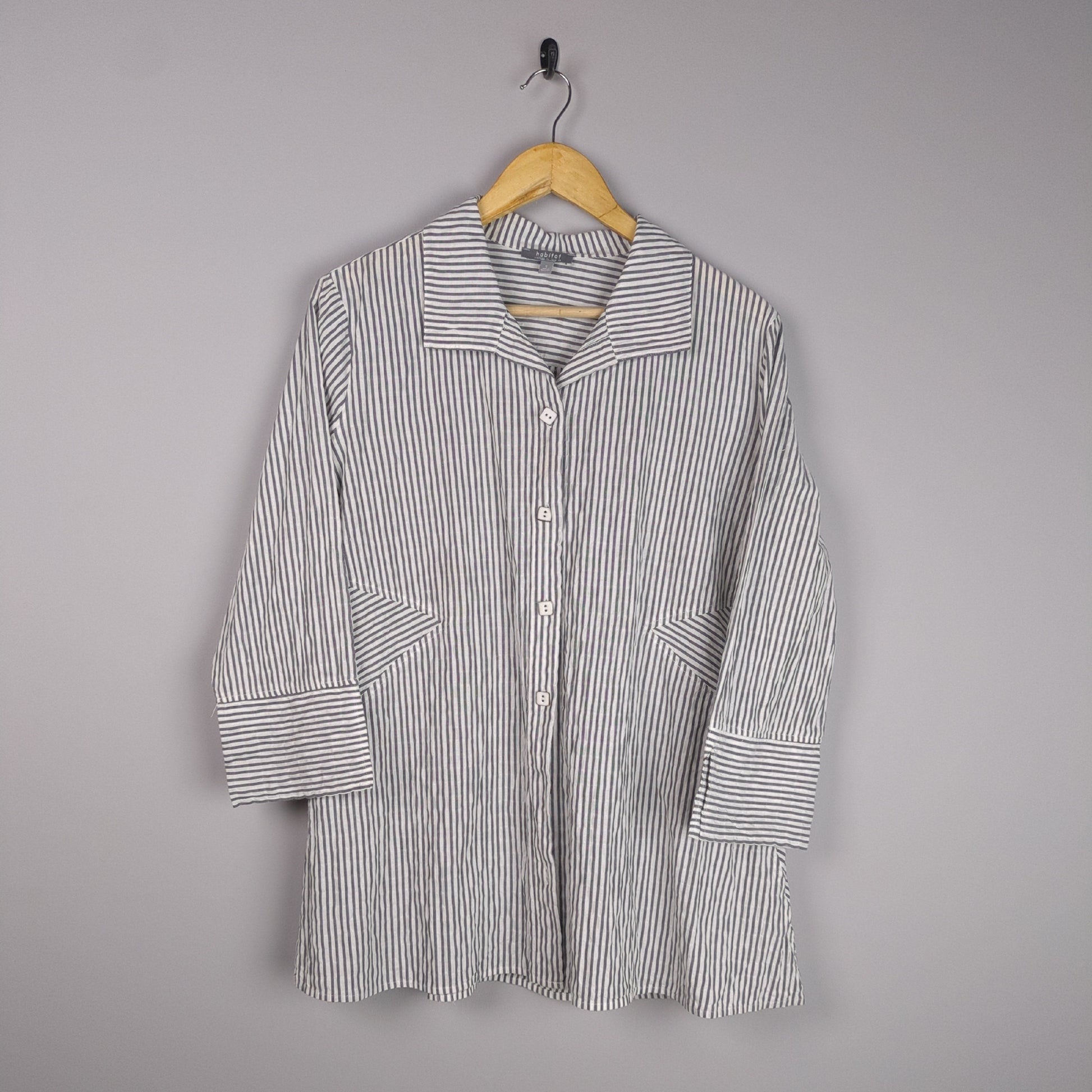 A stylish button-down shirt featuring a classic blue and white stripe pattern.