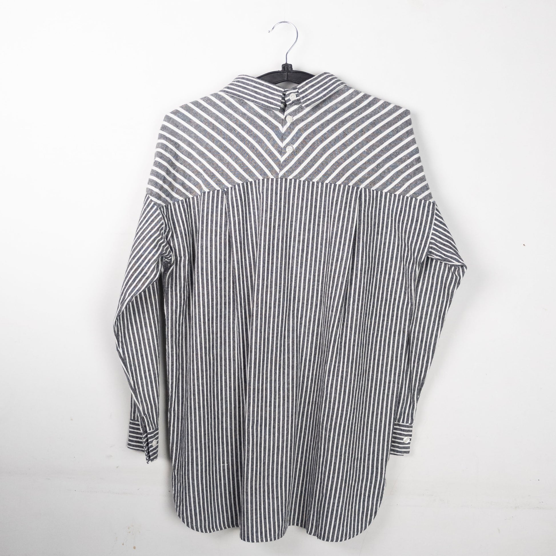 This stylish button-down shirt features a classic striped pattern, perfect for adding a touch of sophistication to any outfit. The shirt has a unique front and back collar button style,