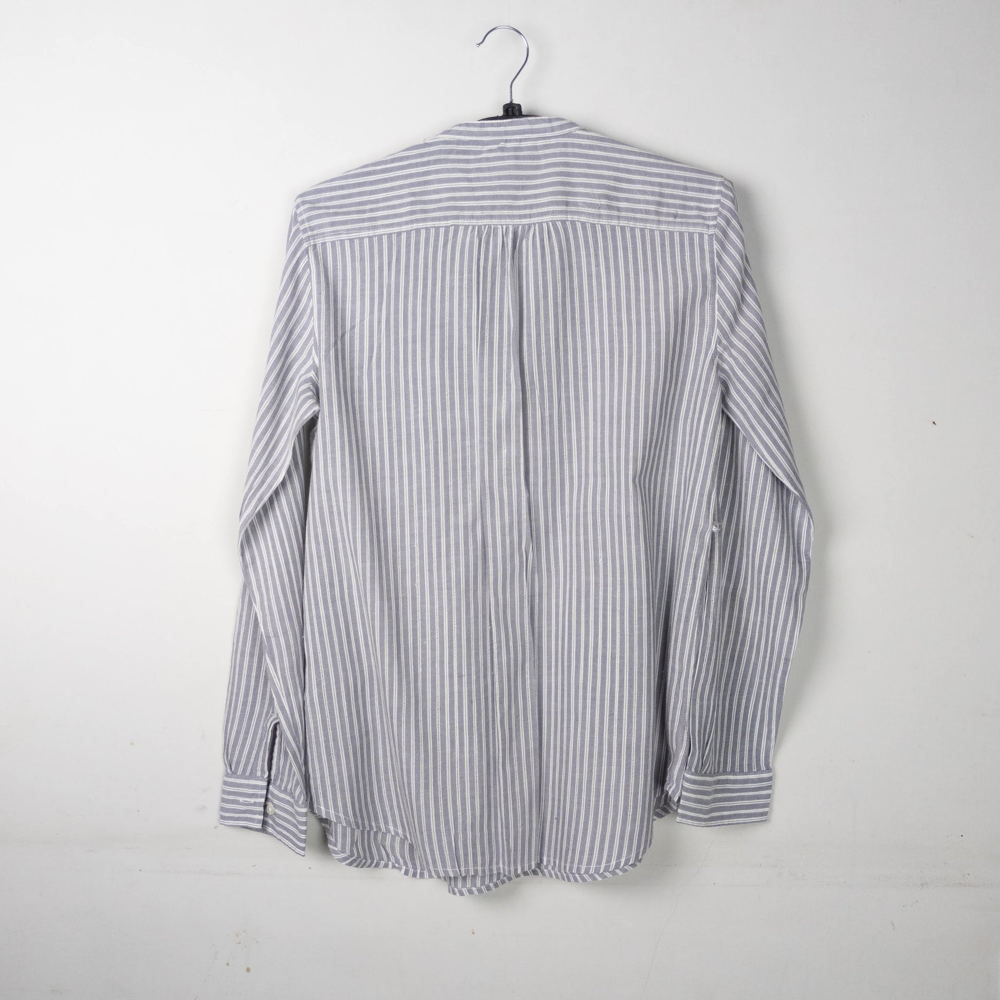 This long-sleeved blouse features a collared v-neck with a striped pattern and a button-up front.