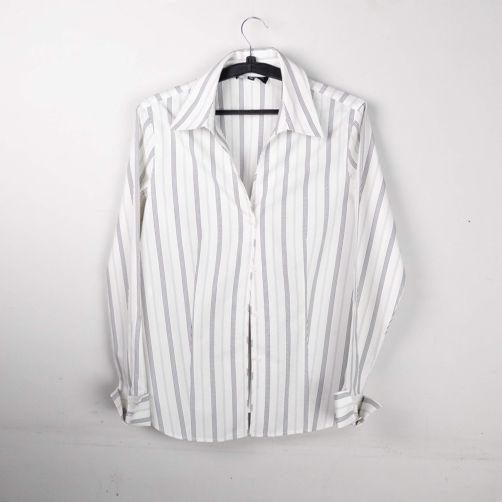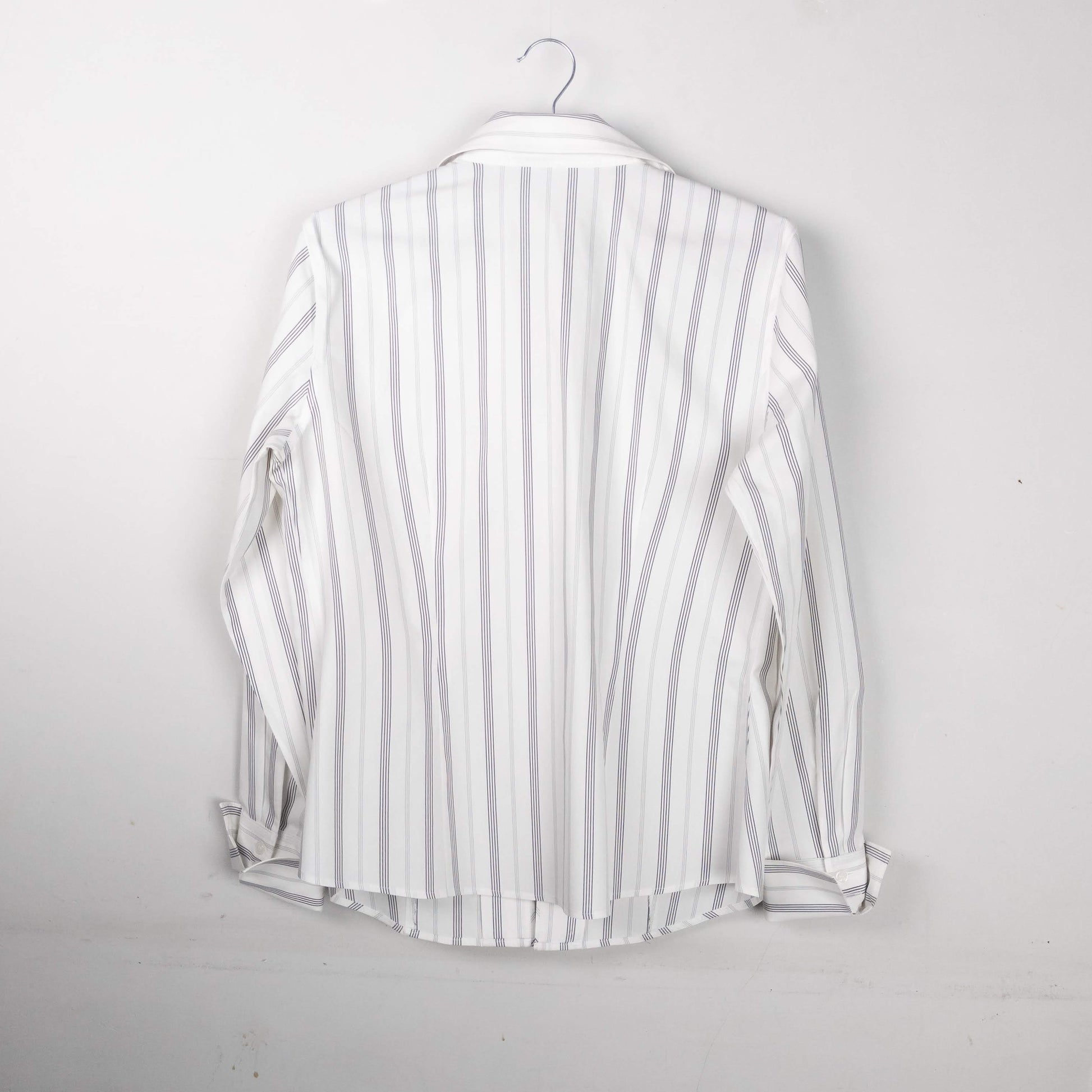 This button-up shirt features a vertical stripe pattern, making it a versatile and stylish piece.
