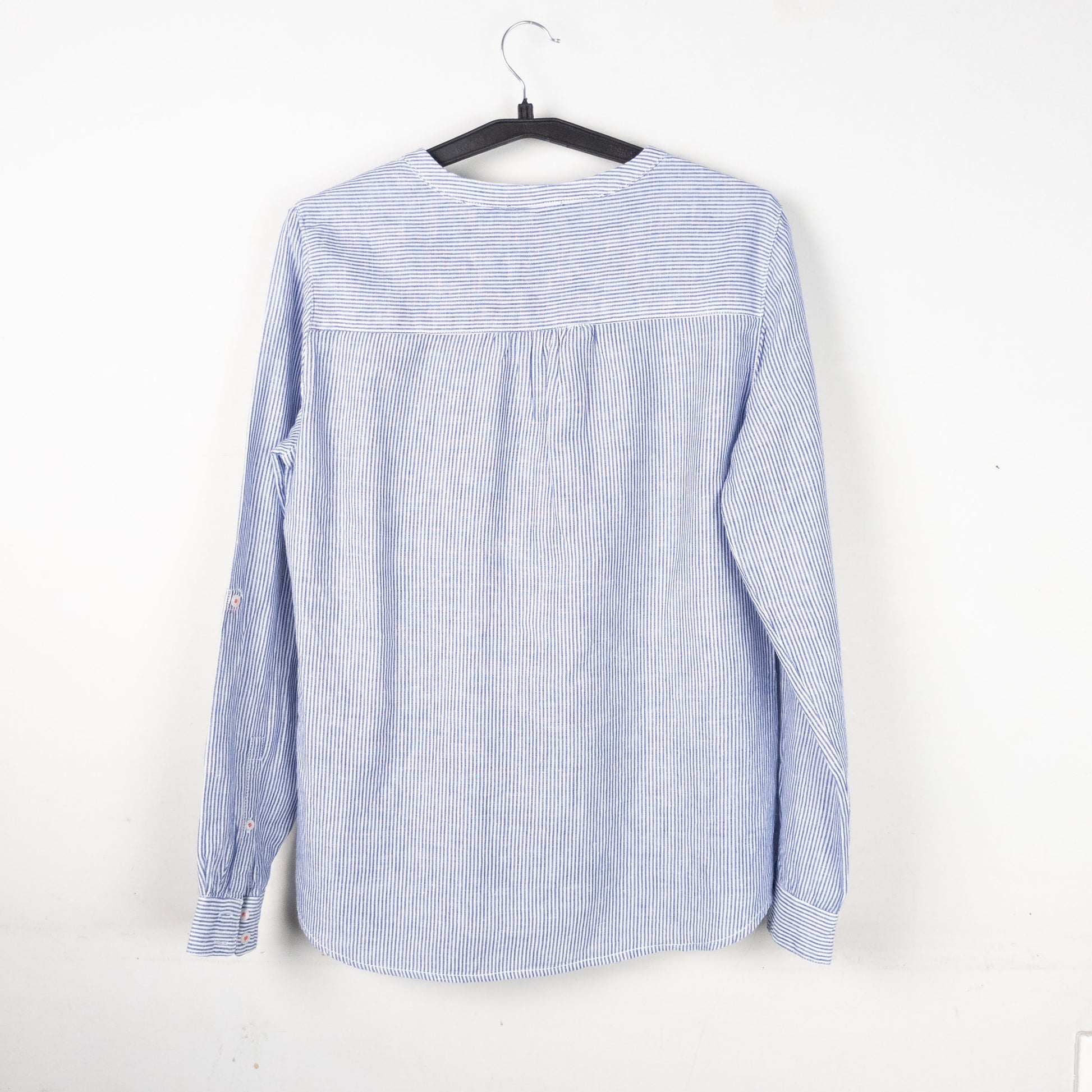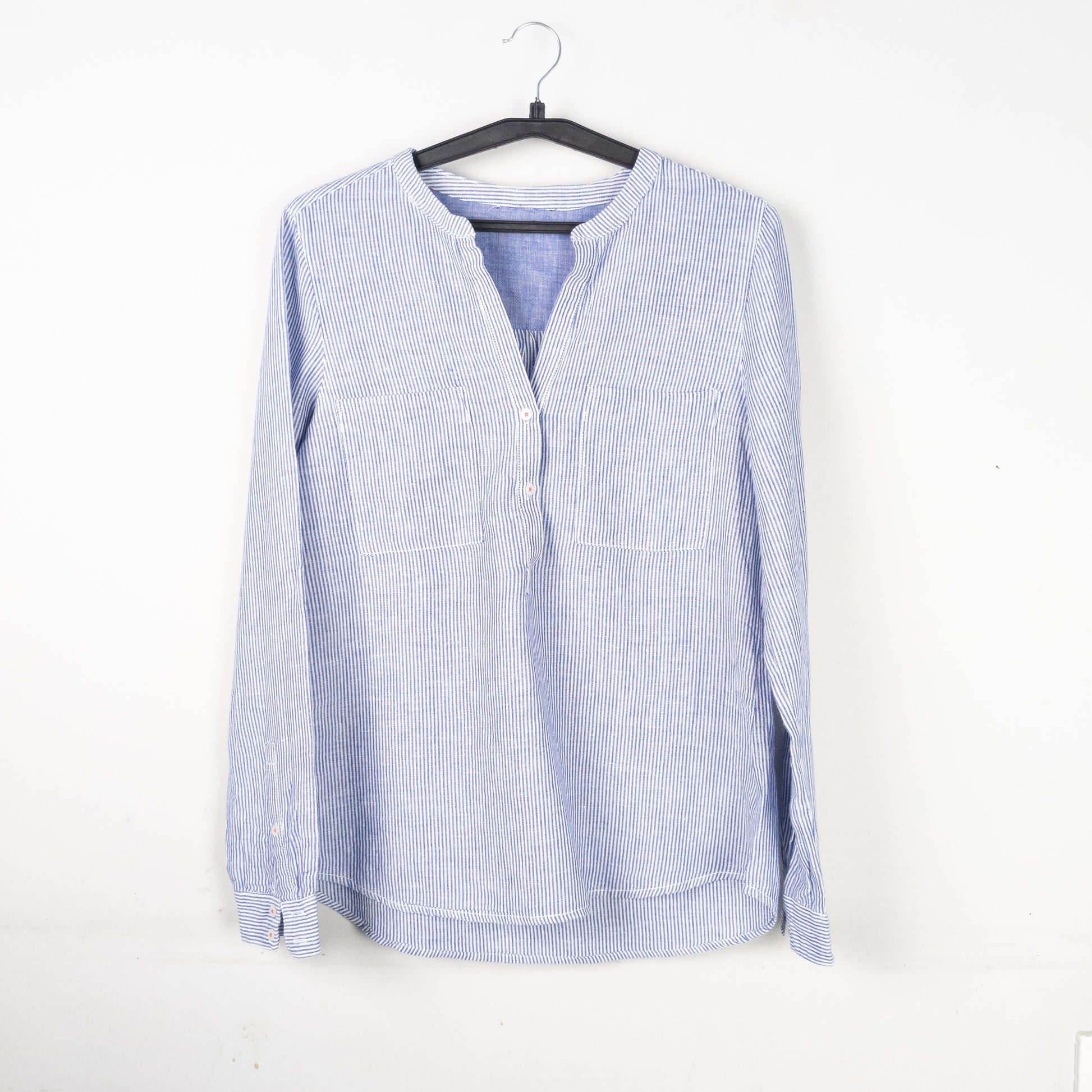 This is a blue and white striped long sleeve shirt with a v-neck collar.