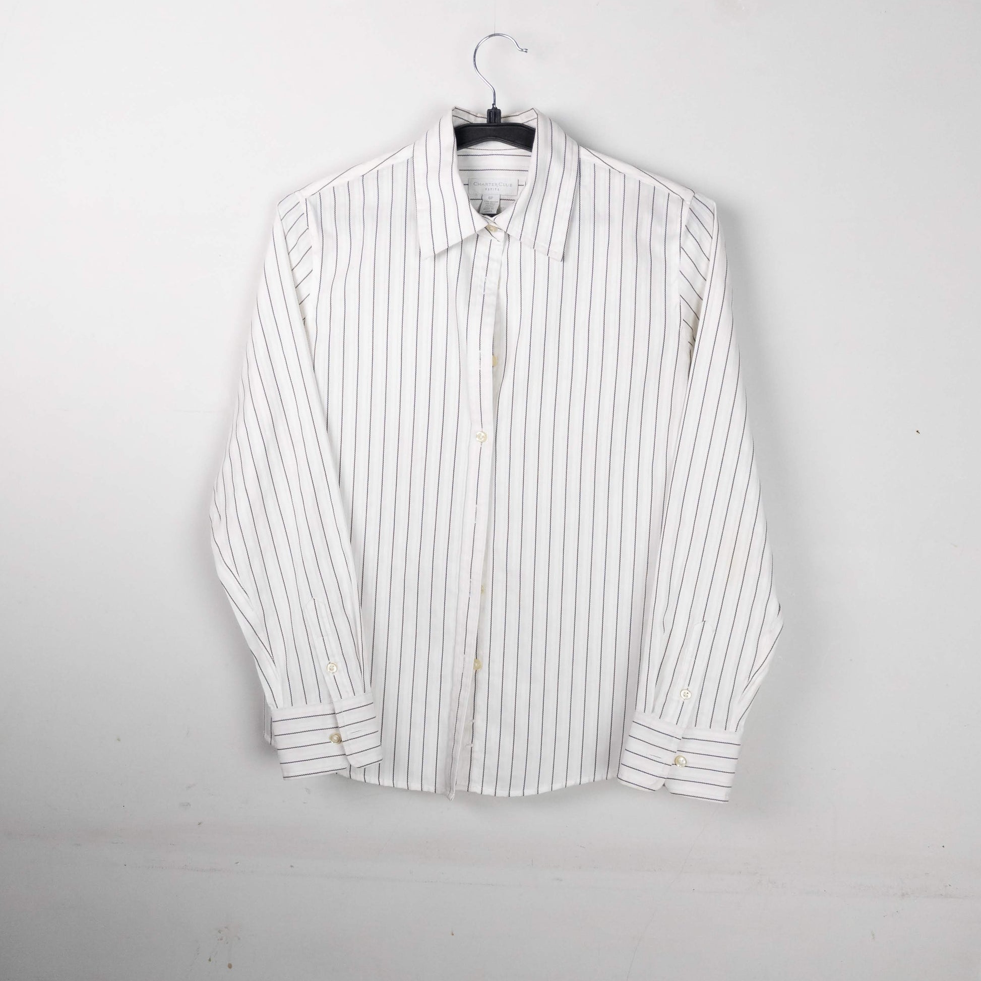 A classic long-sleeve button-up shirt featuring a white base with subtle stripes.