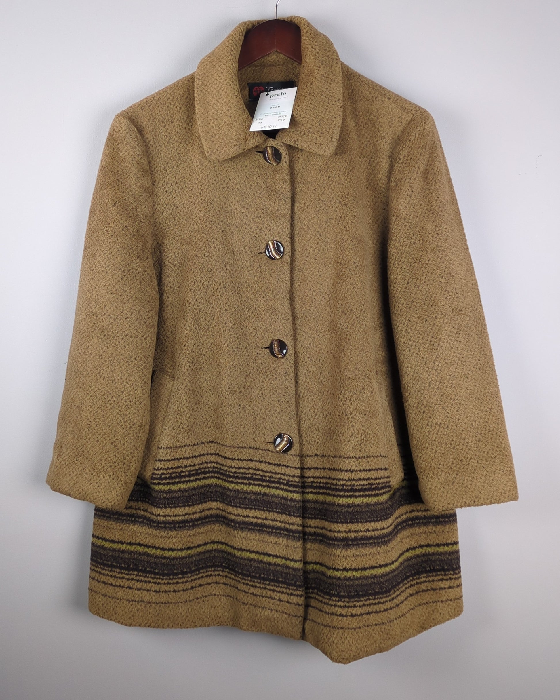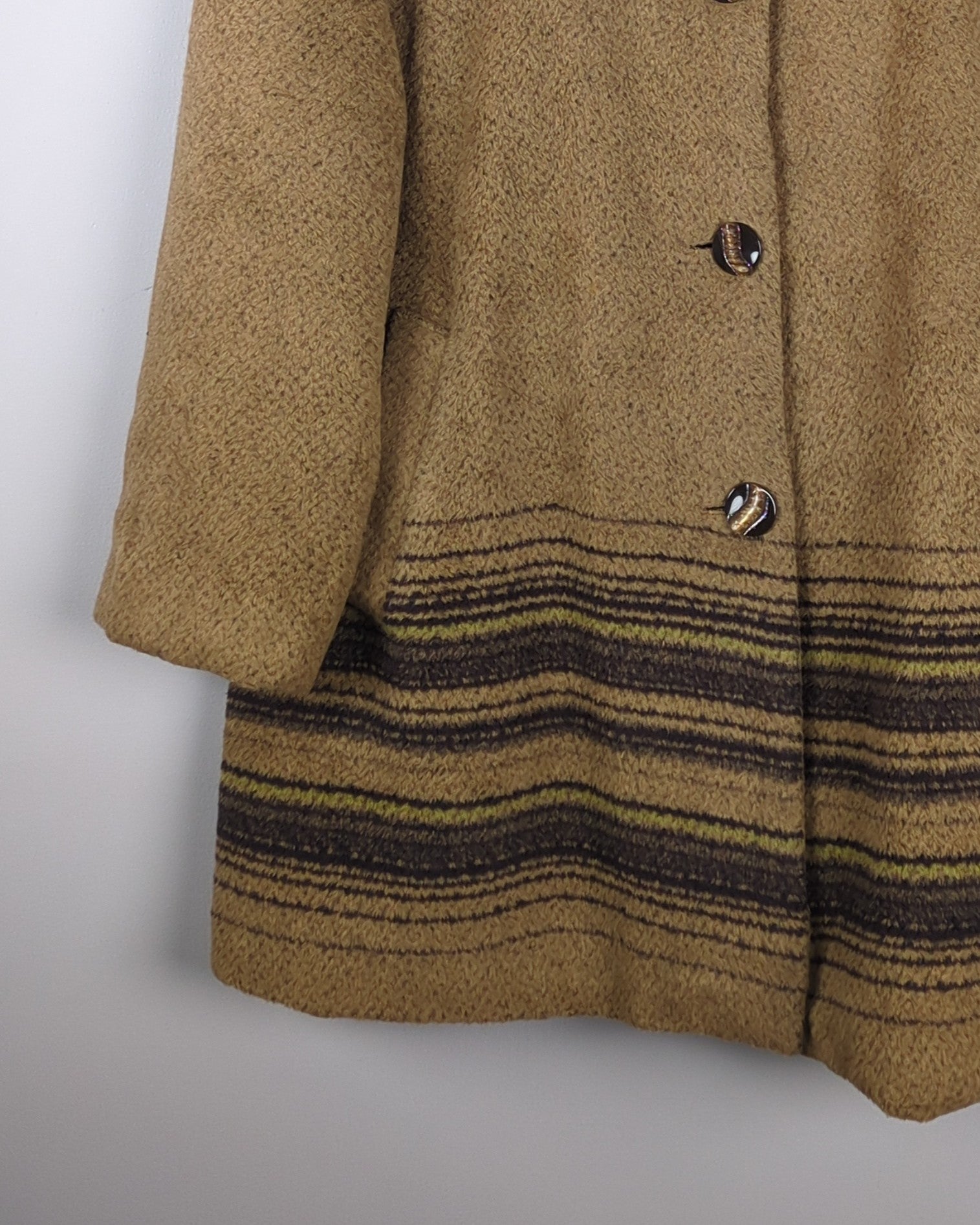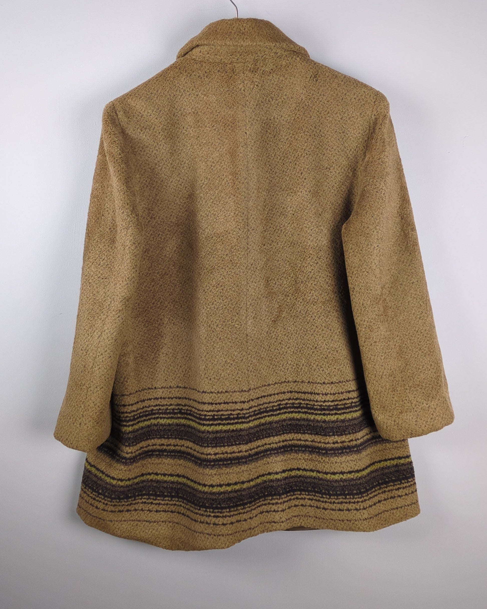A delightful coat in a cozy, textured caramel hue, adorned with rich, earth-toned stripes at the hemline.
