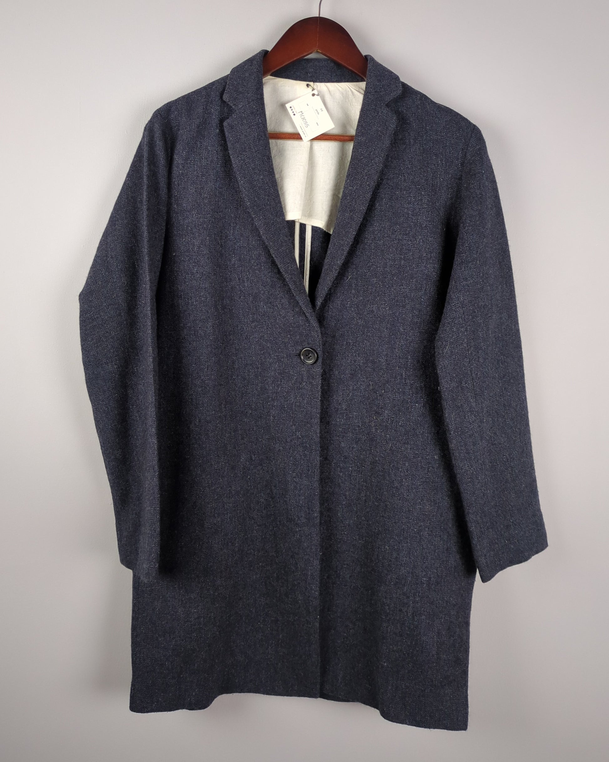 This long-sleeved coat features a textured fabric, lapel collar, and a single-button closure.