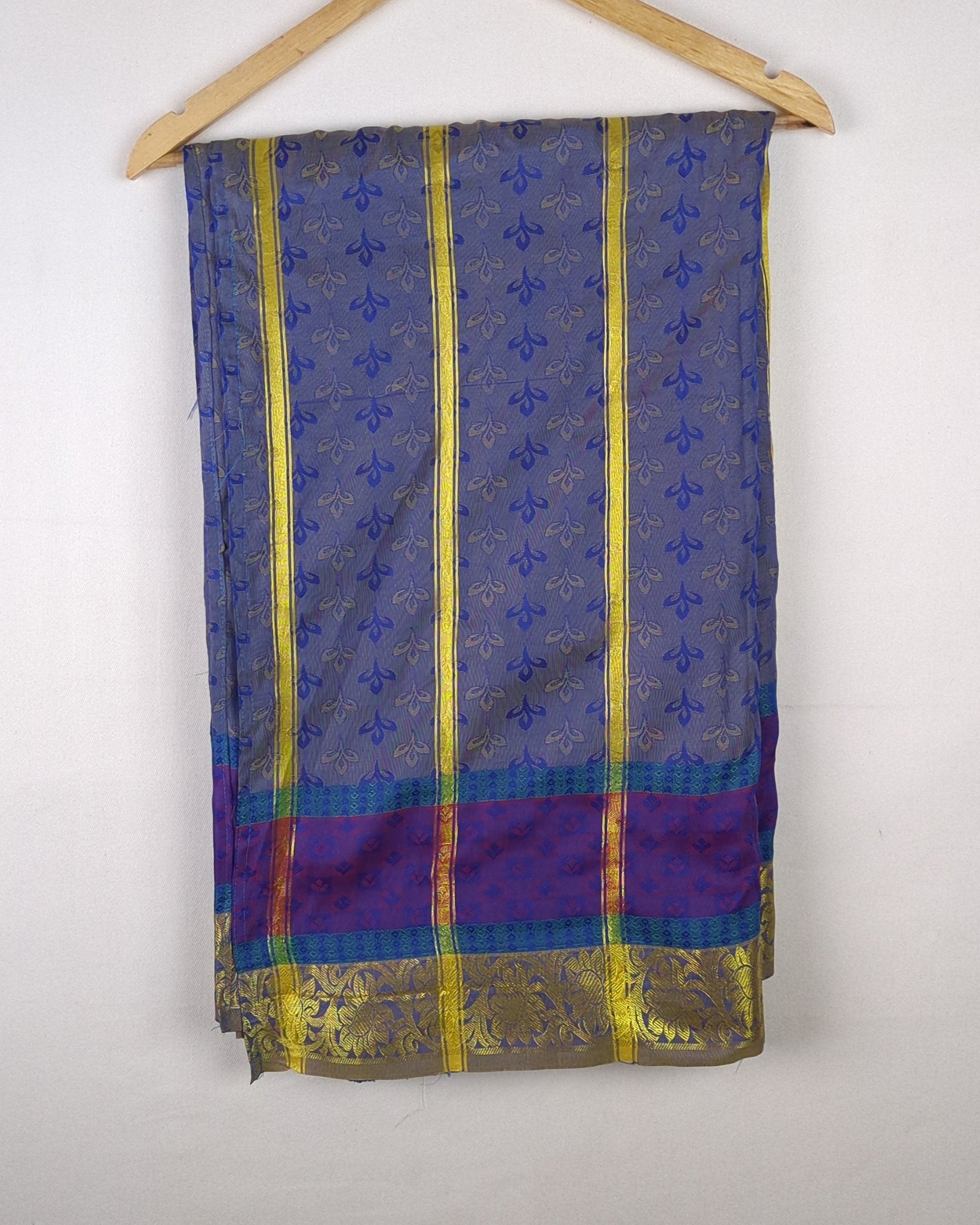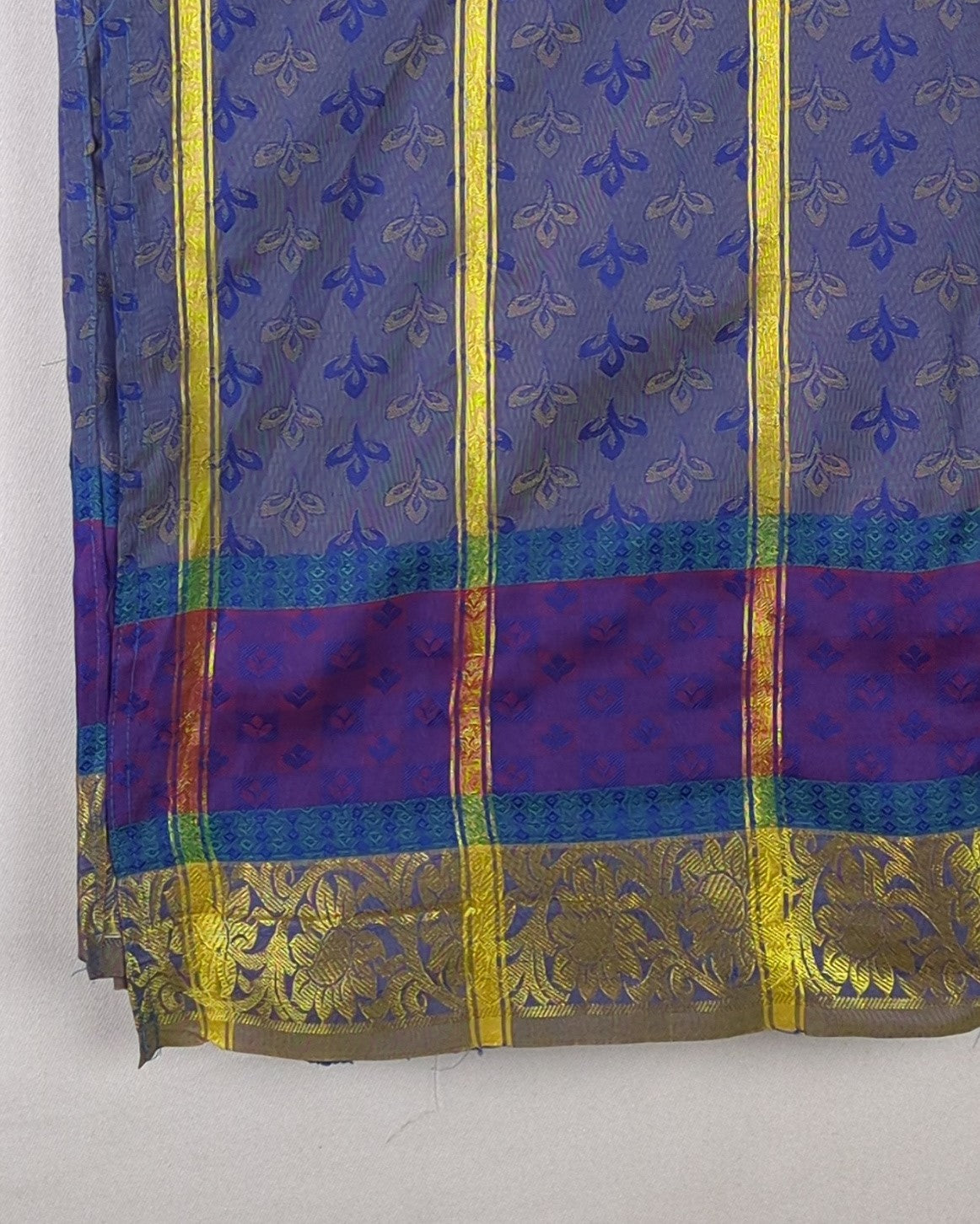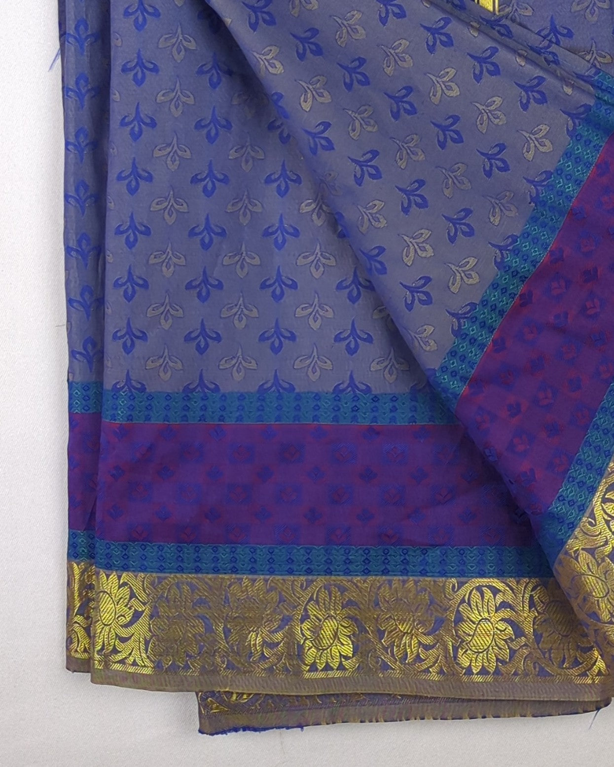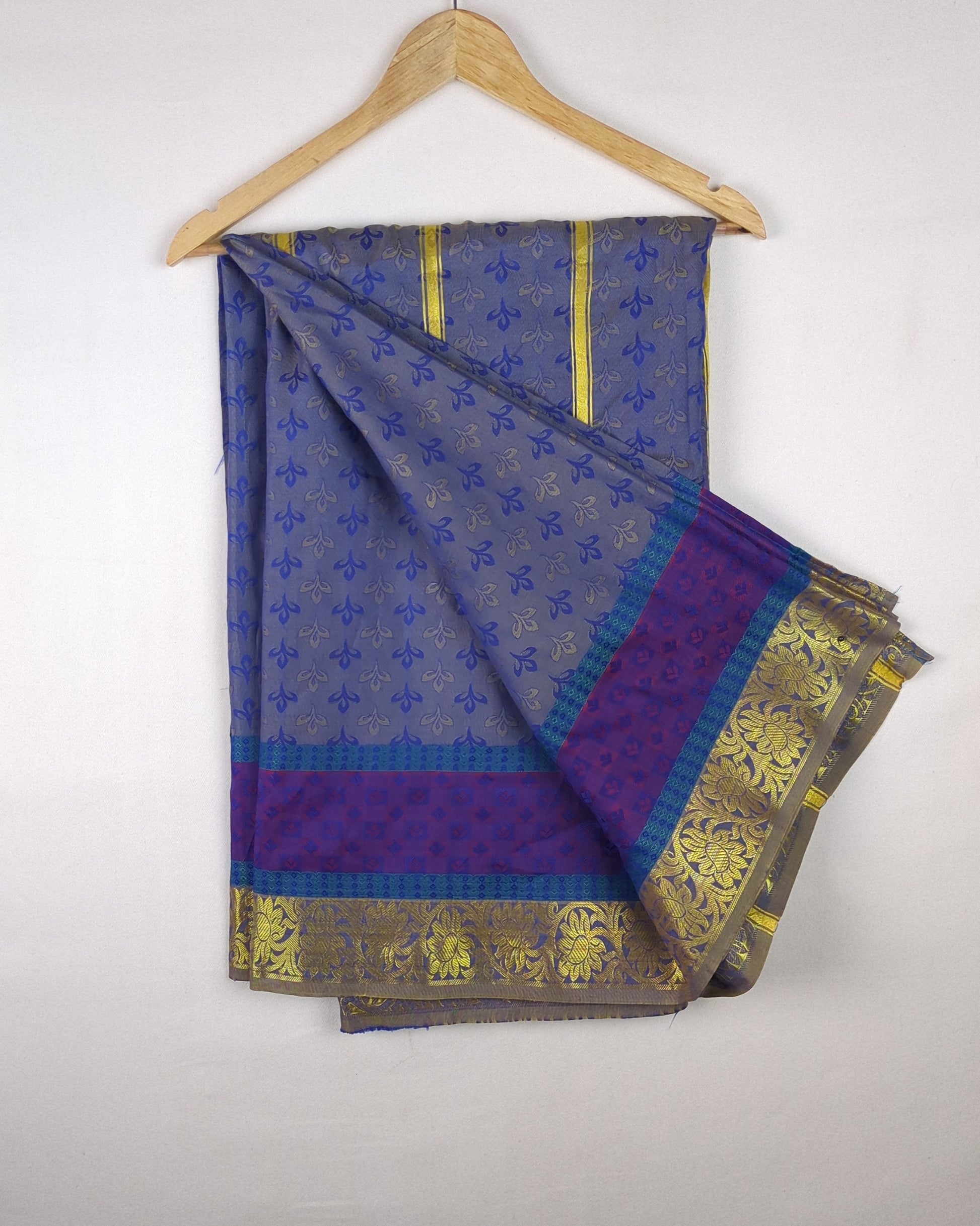 Traditional blue and purple silk-blend saree featuring gold zari stripes and an ornate floral border.