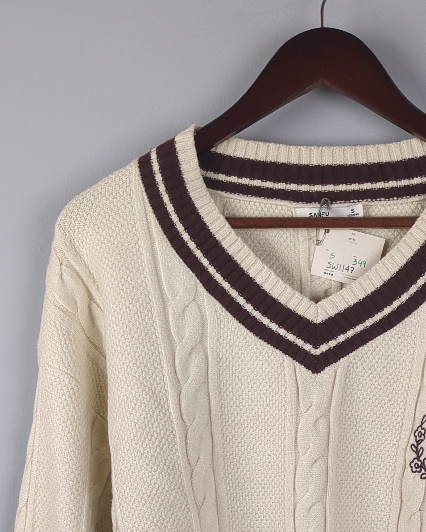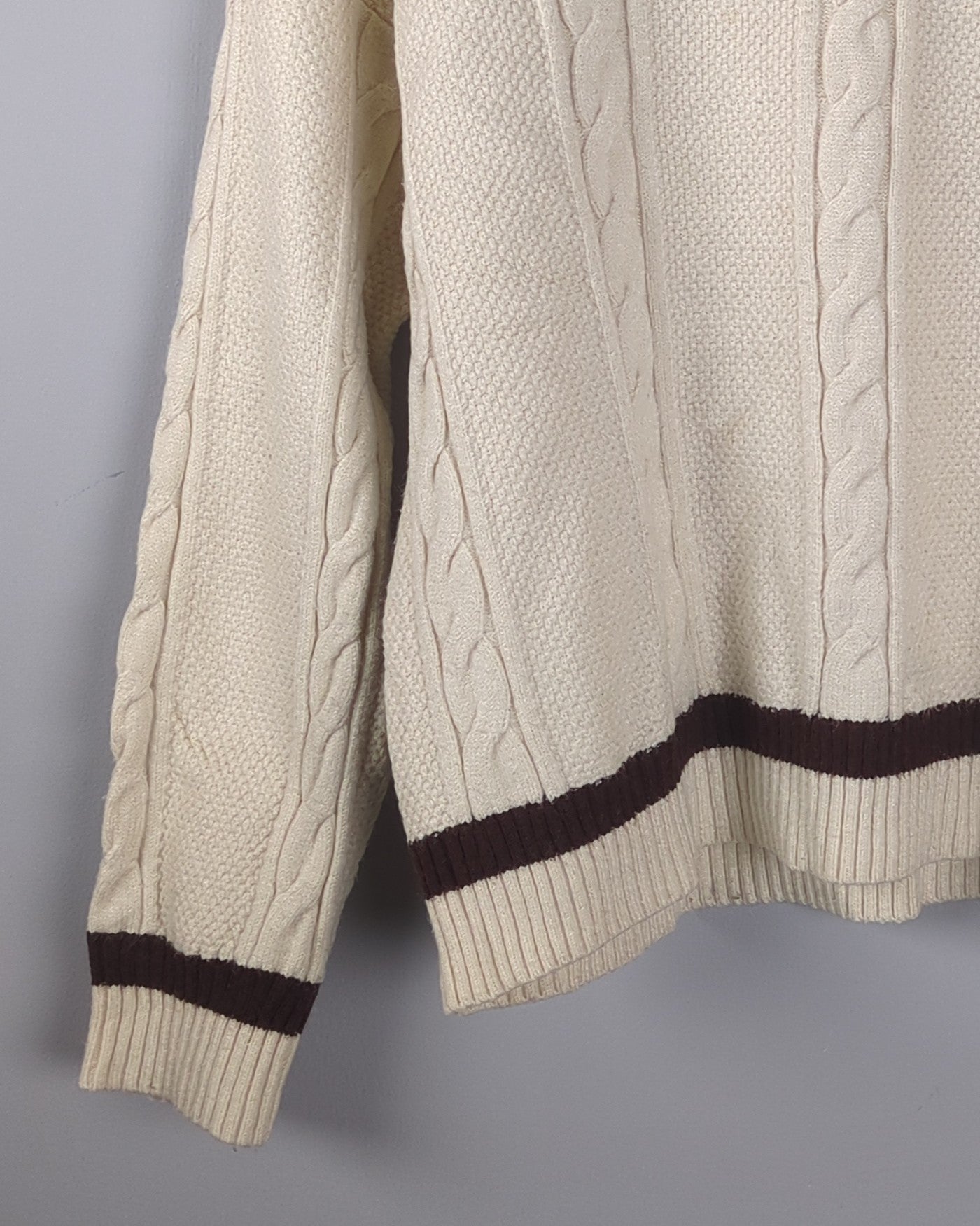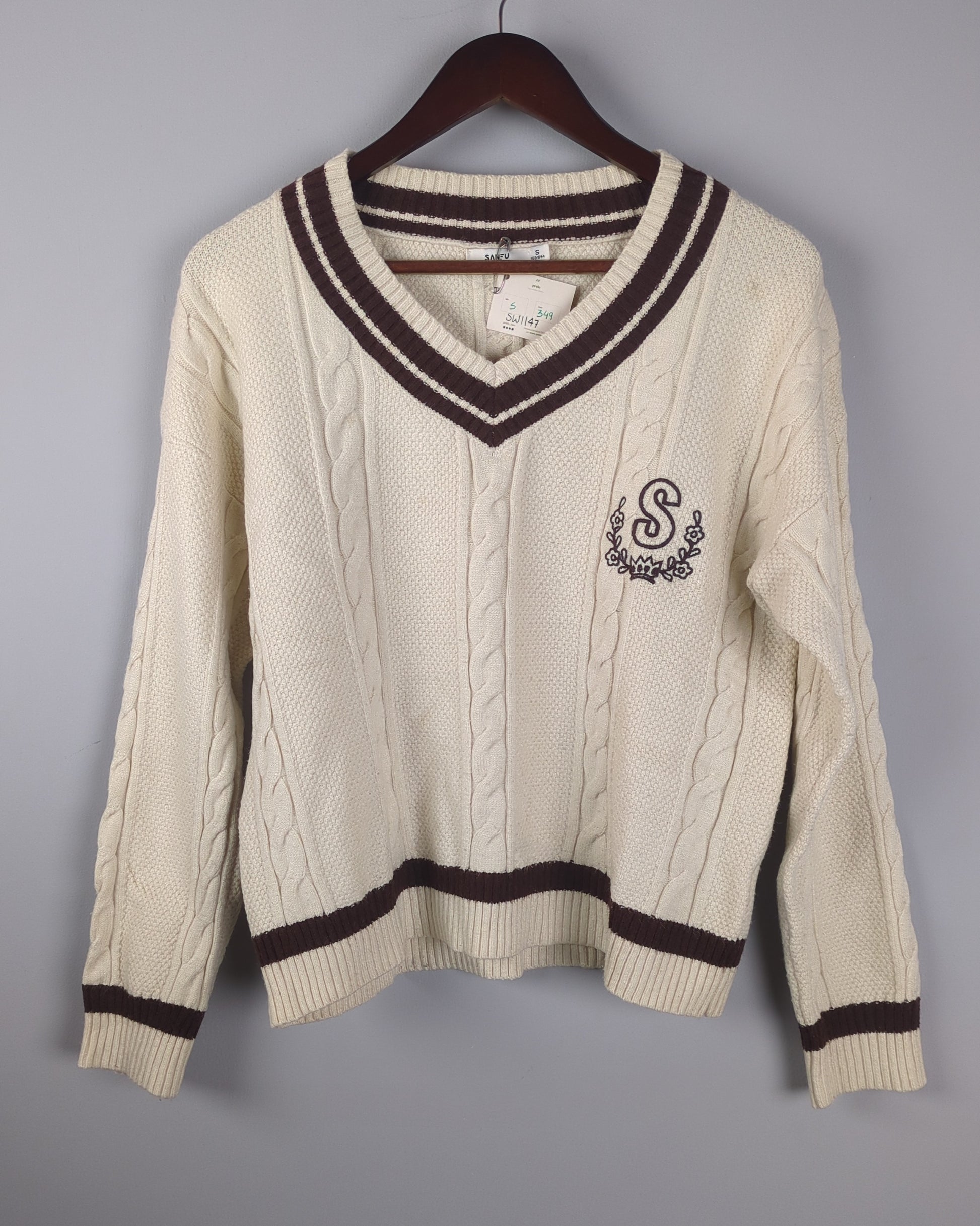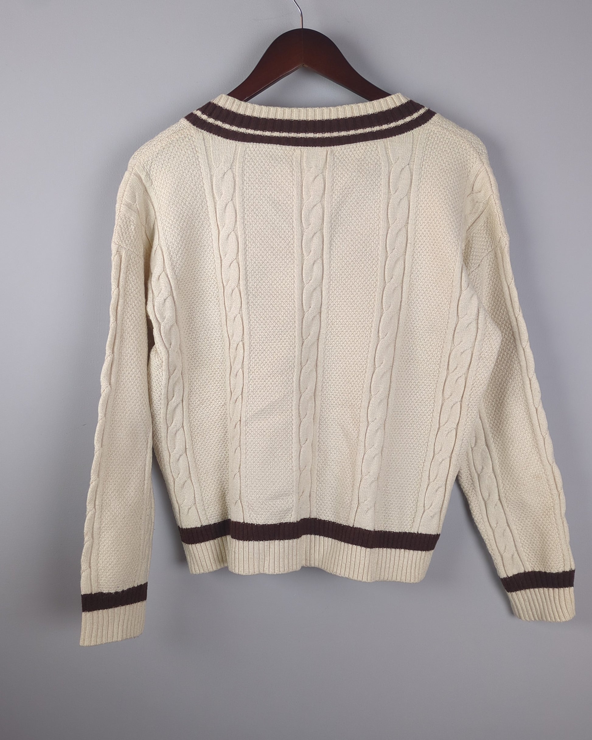 This cozy V-neck cable knit sweater features classic brown stripes and an elegant embroidered initial, perfect for a sophisticated yet comfortable look.